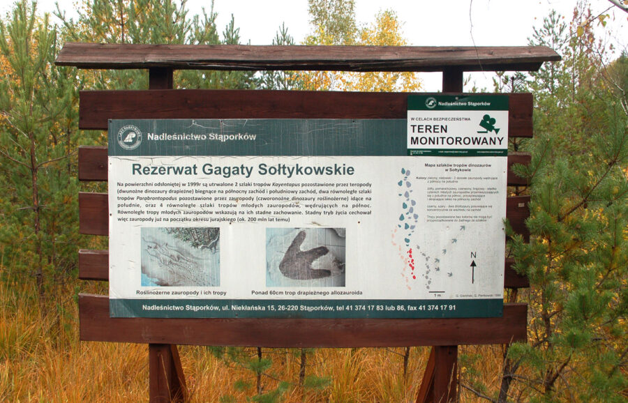 Drugim, znacznie ważniejszym odkryciem na obszarze tego rezerwatu, okazały się skamieniałe tropy dinozaurów sprzed około 200 mln. lat. I to nie tylko pojedyncze, ale także spore ich nagromadzenie w jednym miejscu. Odkryto je w roku 1997 i to, obok znajdowanych w pobliżu gagatów, zdecydowało o utworzeniu rezerwatu o powierzchni nieco ponad 13 ha. Dodam, że niegdyś, w trakcie gorączki ich poszukiwań, koczowały w tych miejscach całe grupy kopaczy skarbów.