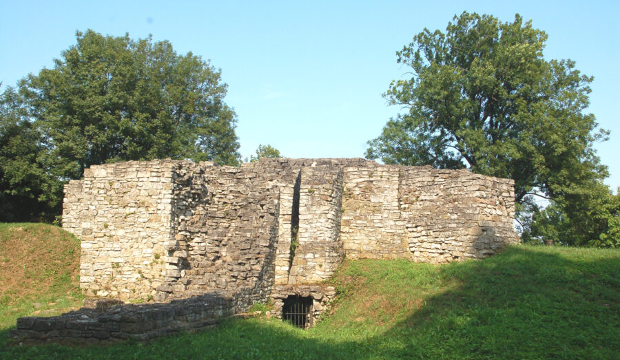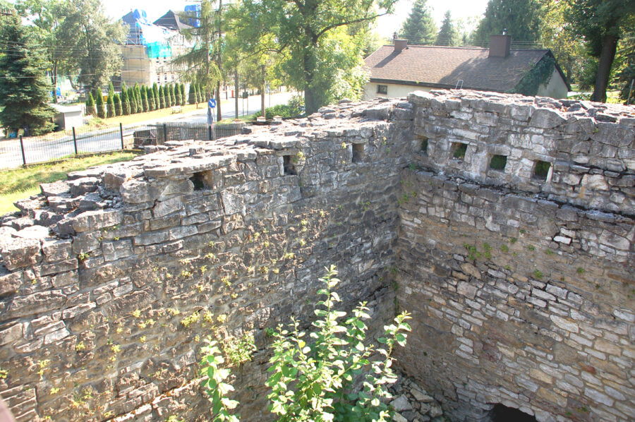 Tłumaczone jest to konfliktem fundatora zamku, biskupa Pawła z Przemankowa, z krakowskim księciem Leszkiem Czarnym. Ale zamek nie powstał nigdy według pierwotnych założeń. Miał się składać – zacytuję informację z poświęconego mu folderu – z grubego na 2,3 m muru obwodowego otaczającego nieregularny czworobok o pow. około 9 tys. m kw. oraz wkomponowanych weń kilku otwartych do wnętrza dziedzińca baszt.