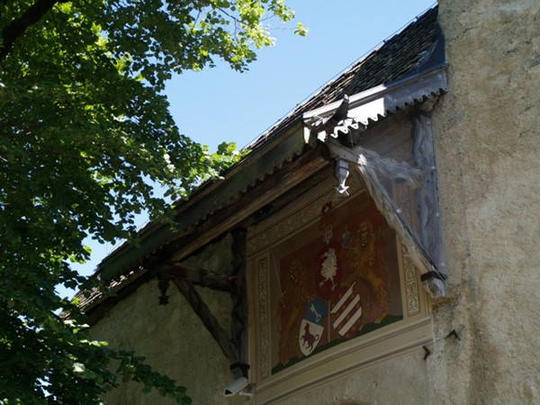 Stare wejście do zamku jest obecnie nieczynne. Ponad bramą (pod daszkiem) znajduje się naścienne malowidło heraldyczne z herbem Gruy?re ? żurawiem (po francusku grue), od którego prawdopodobnie wywodzi się nazwa miasteczka. Żuraw jest w nim wszędzie. Warto się z nim zaznajomić i umieścić Gruy?re w planie turystycznych wrażeń.