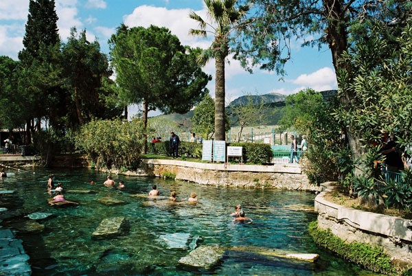 Jeszcze w końcu lat osiemdziesiątych można było spacerować po tarasach, pławić się w ciepłej, leczniczej wodzie i spoglądać na ośnieżone szczyty w oddali. Rozpropagowanie miejsca jako atrakcji turystycznej skutkowało budową hoteli. Wyssały one leczniczą wodę. Teraz po licznych hotelach pozostały fundamenty, działa tylko jeden ? Pamukkale Thermal. Tłoczno tam i drogo. Można się tu kąpać w termalnym basenie, który w starożytności był świętą sadzawką mieszkańców i kuracjuszy Hierapolis ? greckiego, a potem rzymskiego miasta-uzdrowiska położonego ponad białymi tarasami. Teraz nazywany jest basenem Kleopatry, bo kąpiele w tutejszych wodach niwelują jakoby niedostatki urody. Pozostałe hotele wyburzono, gdy wpisywano Pamukkale i Hierapolis na listę światowego dziedzictwa kultury UNESCO.